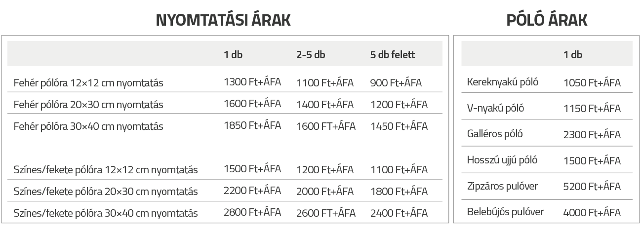 Az árak nyomatonként értendőek, és csak a nyomtatásra vonatkoznak. A pólók ára függ a póló típusától.