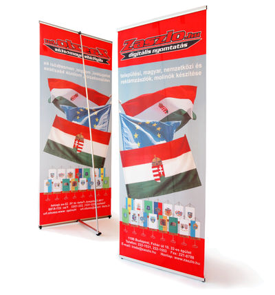 Az L-banner nyomatot poliészter textil anyagból készítjük. A nyomat tartós, az aluminium szerkezet könnyű, egyszerű a szállítása. Nyomat mérete: 90×215 cm