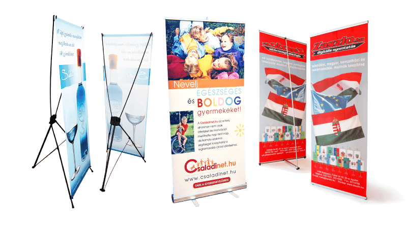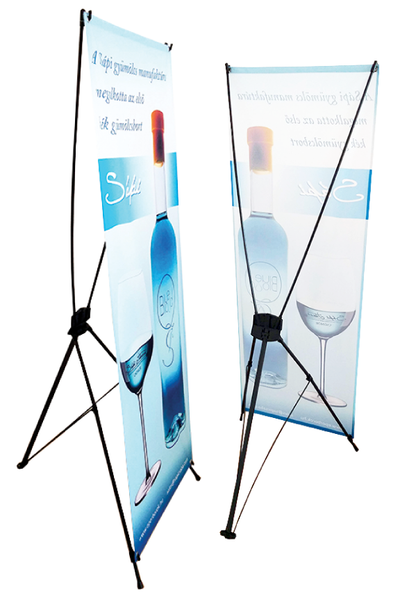 Az X-banner nyomatot poliészter textil anyagból készítjük, a nyomat sarkán elhelyezett 4 ringli segítségével feszül a szerkezeten. Rendkívül egyszerű az össze -, és szétszerelése, a szerkezet összecsukható. A nyomat tartós, az aluminium szerkezet könnyű, egyszerű a szállítása. Kétféle méretben rendelhető:
