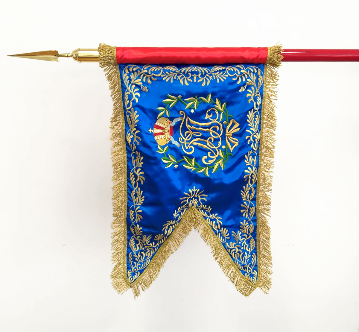 Az igazán különleges és ünnepi kialakítású megoldás a kétoldalas, szatén anyagból készült zászló. A mintát egy-, vagy kétoldalon nyomtatjuk, vagy hímezzük az anyagra. Opcionálisan a zászló széleihez arany színű zsinórt használunk díszítésként, a zászló végén pedig aranyszínű rojtot. Ezt a zászlót csak beltéri használatra ajánljuk.